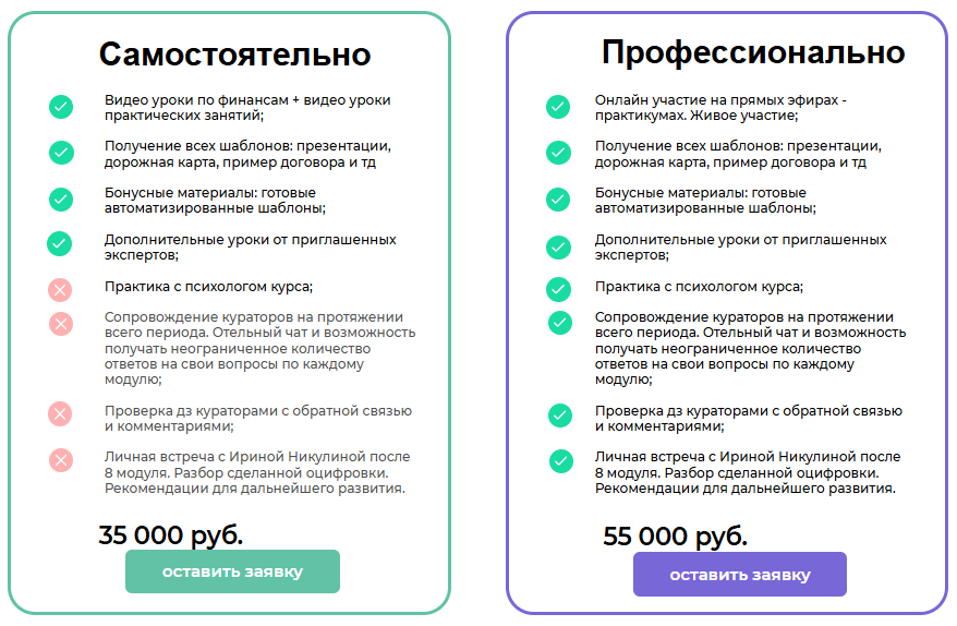- предлагаются два тарифа – “Самостоятельно” за 35 000 руб. и “Профессионально” за 55 000 руб.