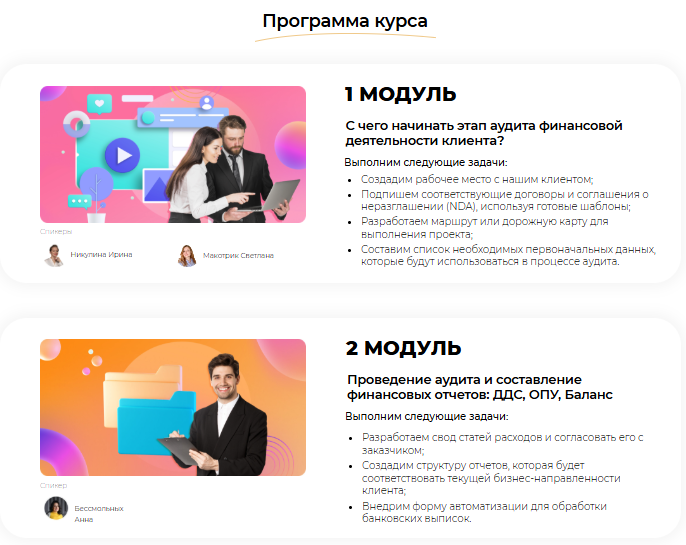 В каждом модуле перечислены основные темы, а также спикеры, которые будут проводить уроки.