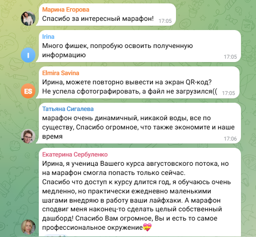 Комментарии в Телеграмм канале единичные, ко многим записям они пустуют. Активность подписчиков в основном низкая. Впрочем, сразу после окончания марафона своими впечатлениями поделилось несколько десятков учеников, мнения положительные.