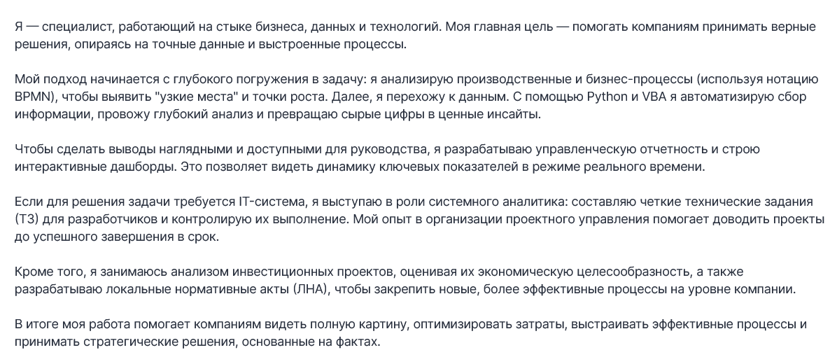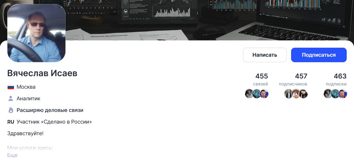 О себе трейдер рассказал на своей странице в соцсети TenChat. Судя по резюме, трейдер Исаев Вячеслав – опытный и известный аналитик, который умеет управлять бизнес-процессами, а также помогает другим людям выявлять «узкие места» и точки роста.