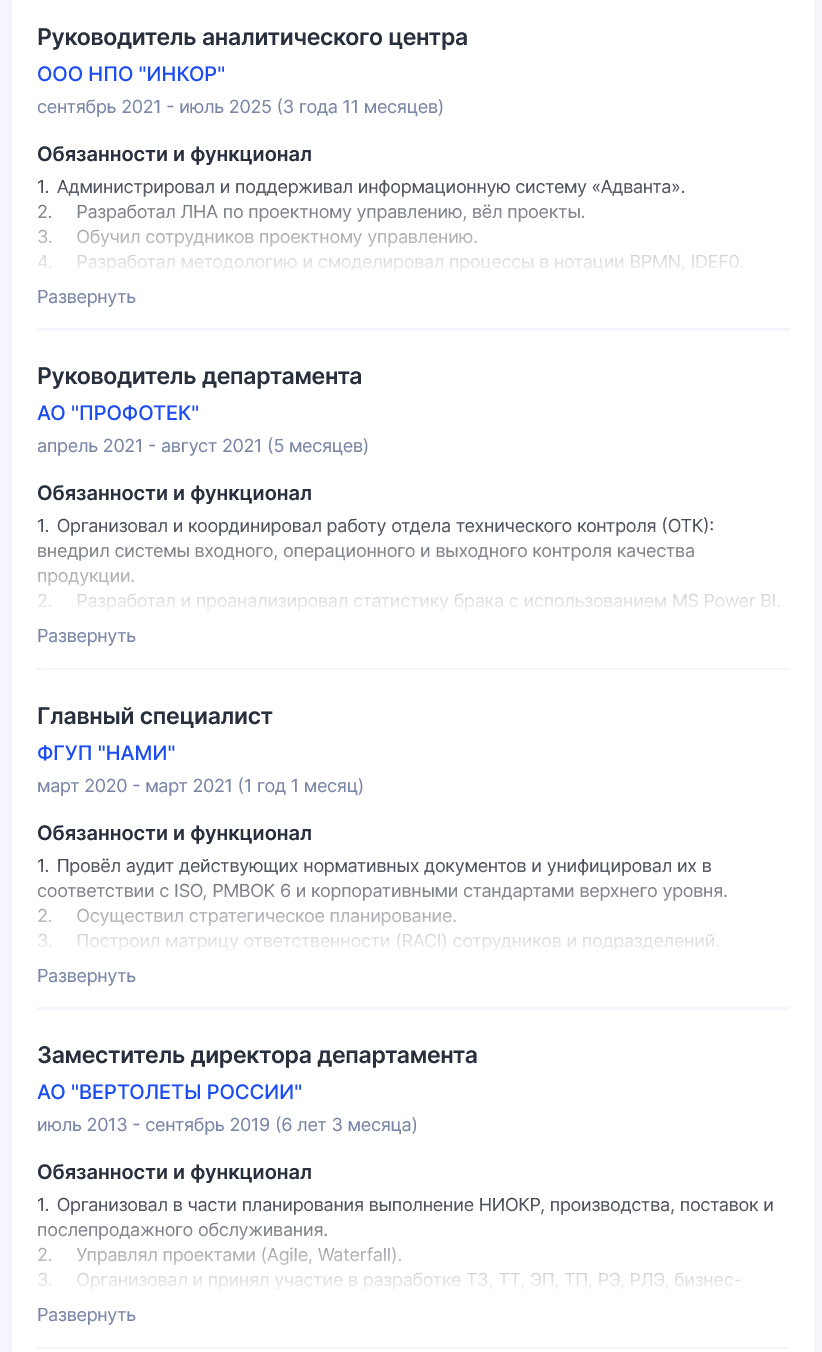 Однако никаких дипломов и сертификатов в соцсети TenChat гуру не разместил. Также здесь указано, что мужчина имеет работы 25 лет и 8 месяцев. На странице приведен перечень предприятий, где трейдер занимал руководящие должности.