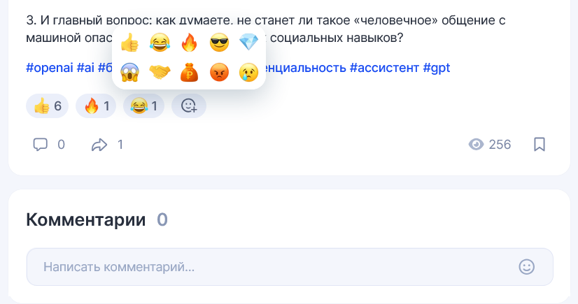 В сообществе на платформе TenChat комментариев под постами нет, а реакции можно ставить любые: как положительные, так и отрицательные.