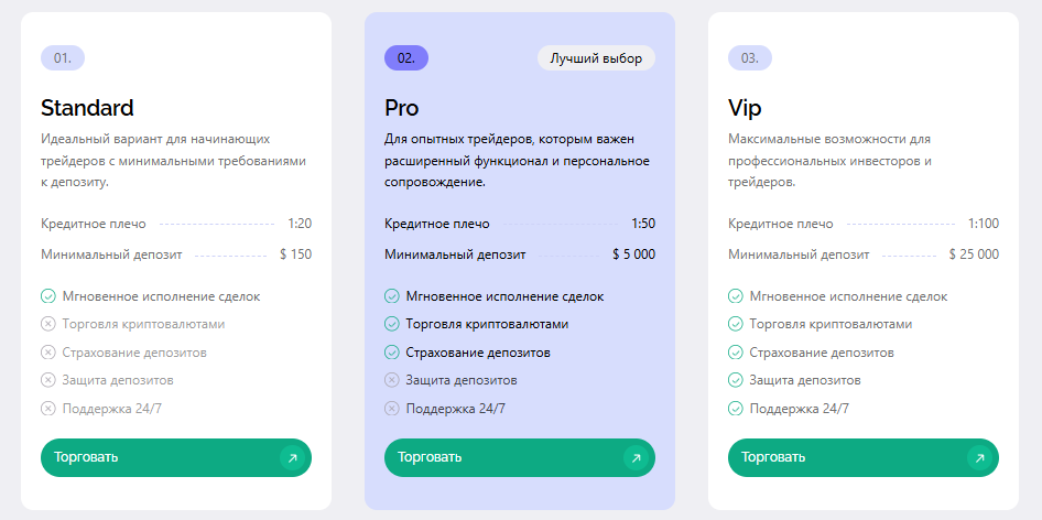 - Standard предполагает минимальное внесение от $150 и кредитное плечо 1:20;