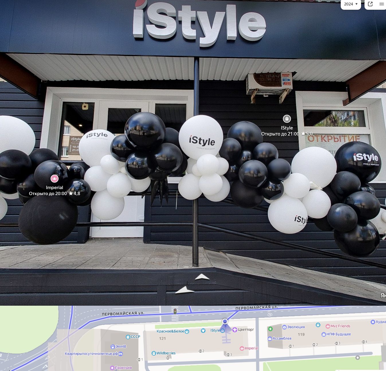Заявлено, что магазин находится в Липецке на улице Первомайская дом 1. Мы поискали такую компанию на «Яндекс Картах», и обнаружили, что она действительно существует. На стрит-вью от 2024-го года можно обнаружить вывеску этого магазина. Композиция украшена шариками, что говорит о недавнем открытии.