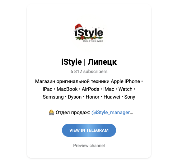 «айСтайл Эпл айФон» — канал в Телеграмме, который принадлежит расположенному в Липецке магазину техники. Он торгует преимущественно продукцией Apple, а именно: iPhone, iPad, MacBook и др. Также в ассортименте есть техника от других популярных брендов, например, Samsung, Sony и Dyson.