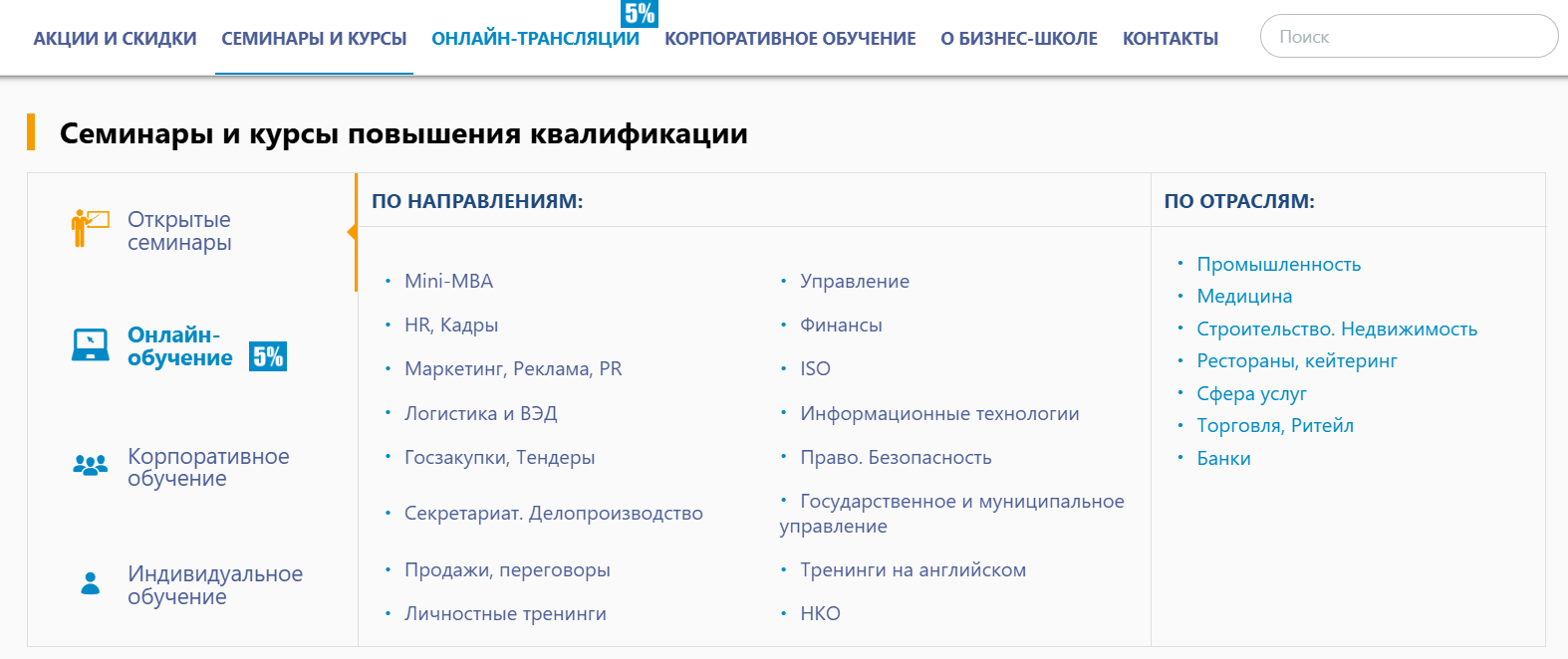 По направлениям выбор довольно широкий, например, есть Mini-MBA, курсы по управлению и финансам, HR, маркетингу и PR, логистике и ВЭД, госзакупкам и тендерам. Отдельно идут программы бизнес-школы ITC Group по ИТ, праву и безопасности, стандартам ISO, продажам и переговорам, делопроизводству и личной эффективности. Плюс доступны тренинги на английском языке.