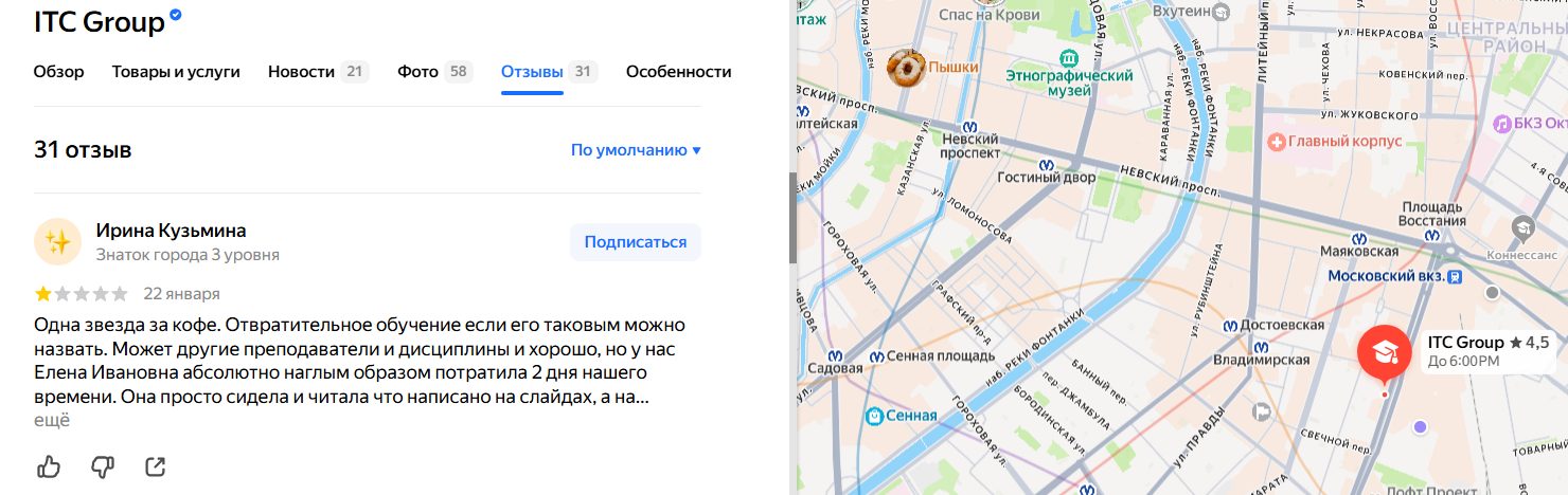 Мнения в рунете противоречивые, например, в приложении «Яндекс Карты» отзывы о бизнес-школе ITC Group положительные в большей мере с похвалой материалов и кураторов.