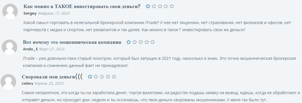 Мы проверили деятельность trade investing сервиса Itrade и сделали вывод, что пользоваться услугами нелегальной организации определенно не стоит. Мы не рекомендуем пользователям взаимодействовать с аферистами из ItradeVc и Itrade Ee.