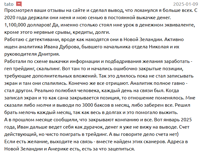 Учитывая минимум данных в интернете, мы нашли отзыв о трейдере криптовалют Иване Дуброве. Это позволит понять, какое впечатление сложилось у клиента от работы с ним. Положительных мнений от довольных пользователей в интернете нет, зато есть отрицательное.
