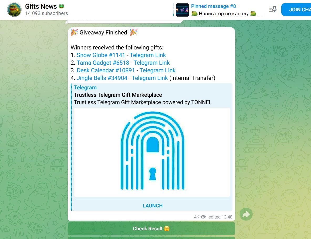 Так, канал @nftgift_shop делился историями о розыгрышах, где Jingle Bells #34904 стала подарком победителю через Trustless Telegram Gift Marketplace powered by TONNEL, подтверждая, что Jingle Bells подарки реально разыгрываются и отправляются по организованным механикам.