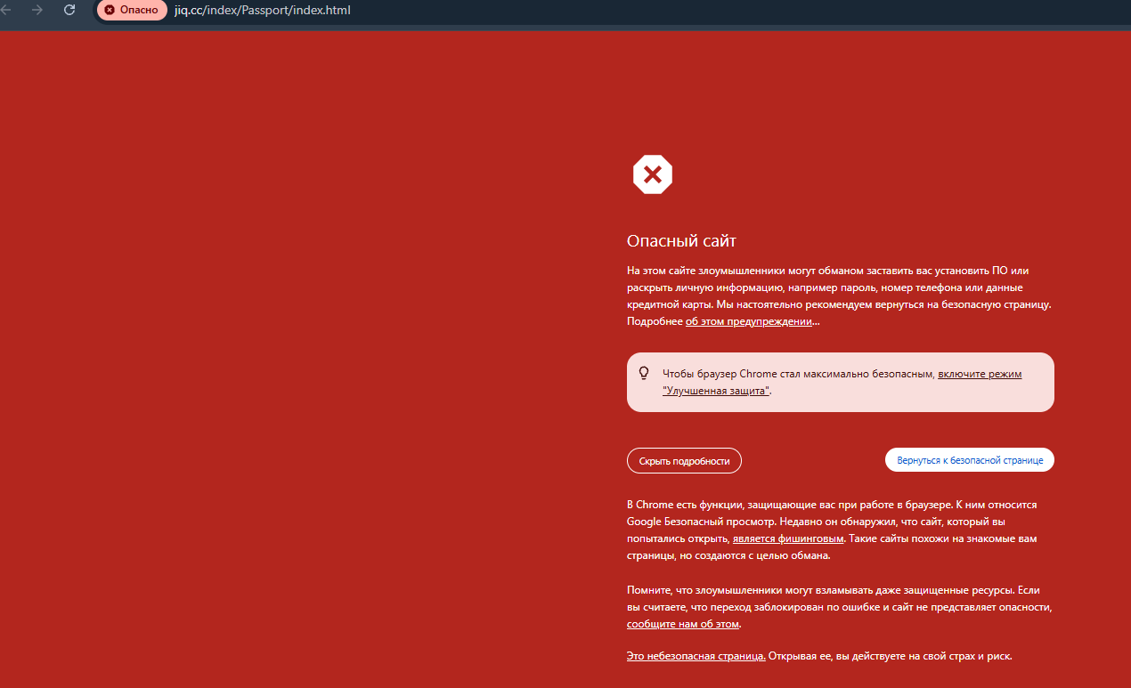 Оказалось, что не так просто узнать, что за сайт Jiq cc, так как кошелек закрыт от публичного доступа и определяется браузером как потенциально опасный ресурс. При включенной защите система предупреждает, что при переходе по адресу пользователь может столкнуться с фишинговой угрозой и передать свои данные злоумышленникам.