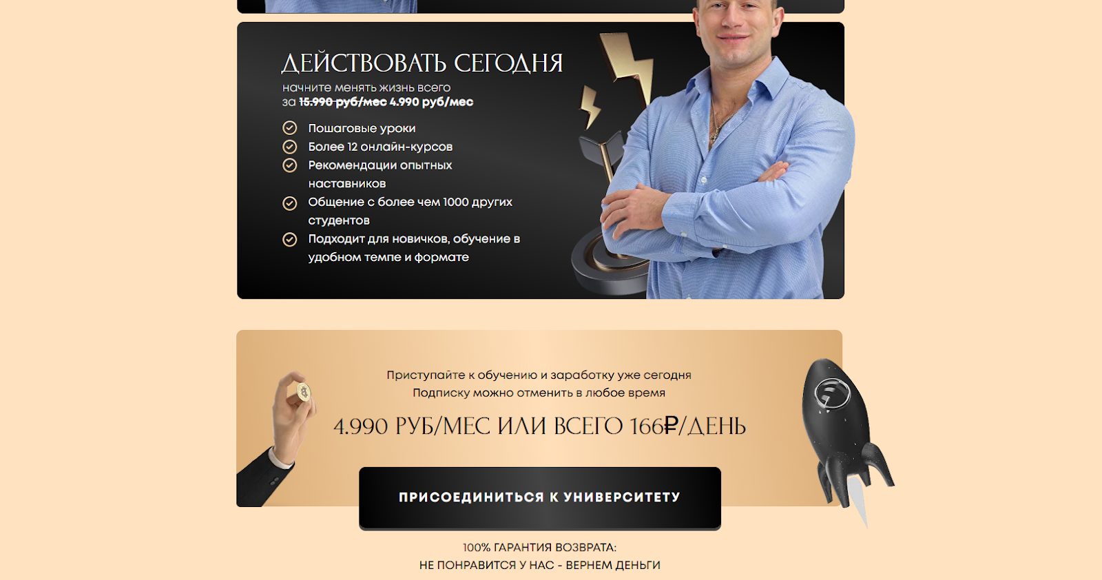 Цена также может отражать содержание внутри уроков, сейчас доступ сразу ко всем материалам стоит около 5 000 рублей. Автор конечно же рассказывает о скором повышении стоимости в 3 раза, а люди обычно видят таймер на 18-20 часов, однако это маркетинговая уловка. Если подождать и обновить страницу, то он сбросится. Также неизвестно, если материалы якобы помогут выйти на доход до 1 000 000 рублей, зачем отдавать их так дешево? Очевидно, что инфлюенсер зарабатывает именно от продажи курсов и рекламы сторонних проектов, поэтому пытается охватить как можно больше платежеспособных зрителей.