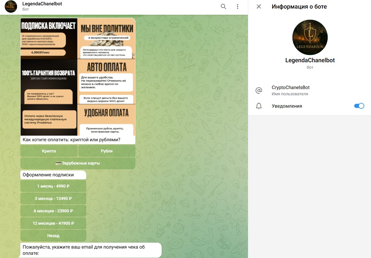 По словам Андрея, также действует гарантия на возврат, когда в течение одной недели можно вернуть деньги без объяснения причины, однако для покупки доступа вас переводят в телеграм бота CryptoChanelsBot, где предлагают оплатить один из тарифов на выбор. При этом среди способов есть лишь крипта или прямой перевод рублями, пользовательское соглашение / договор оферты скрыты. Возможно у команды подготовлены скрытые нюансы, которые не позволят вернуть средства. Для получения чека предлагают ввести почтовый адрес. Единственный способ связи с Андреем это почтовый адрес Lukin A2011 yandex ru.