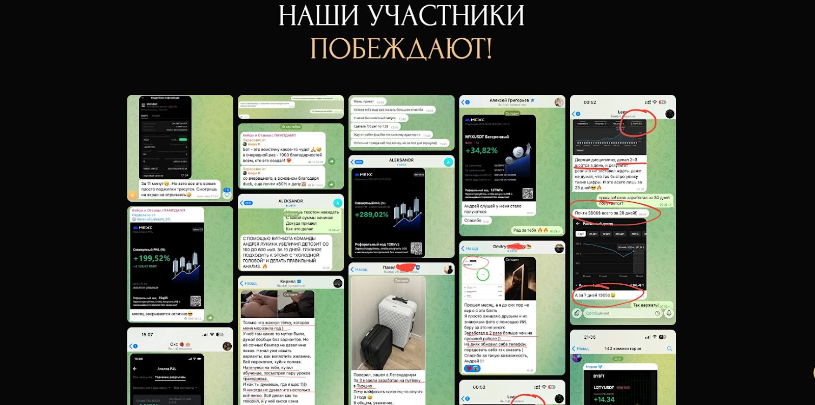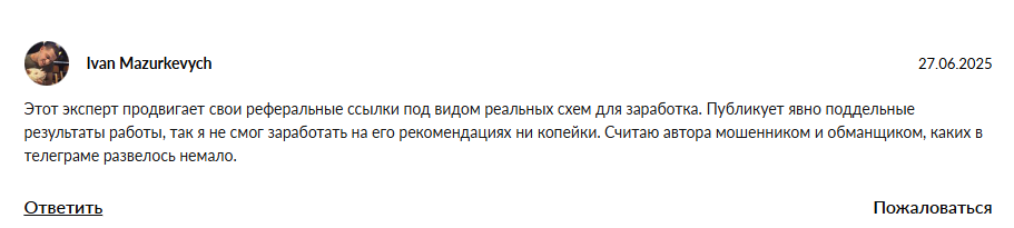 По словам людей Андрей продвигает реферальные ссылки на разные платформы / крипто биржи, а также продает курсы от 5 000 рублей, вокруг чего и строит основной доход. Он подделывает статистику, чтобы привлечь подписчиков и публикует минусовые сигналы для трейдинга в своем клубе по криптовалюте.