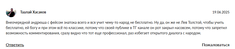 Андрей Лукин на сайте своей школы Легендариум выкладывает огромное количество хвалебных отзывов, однако доверять им не стоит, ведь обычные скрины переписок из телеграмма легко подделать, а в интернете полно разоблачений проекта, где клиенты жалуются на низкое качество уроков и сливают контент из приватного клуба.