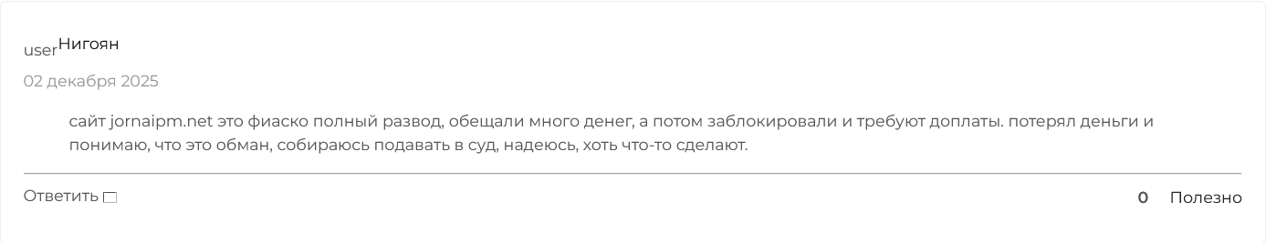 О платформе jrn ipm me отзывы в сети только негативные. Площадка существует не так давно, однако в сети достаточно комментариев от пострадавших пользователей. История у всех одна: пользователи получили предложение по выгодным инвестициям, прошли регистрацию и внесли средства. Какое-то время они наблюдали в личном кабинете рост баланса, менеджеры убеждали вносить их еще деньги, чтобы заработать больше, пока есть возможность. Далее, как только клиенты пожелали снять свои деньги, было придумано множество причин, почему этого сделать нельзя. Таким образом, никто из пользователей платформы своих денег обратно не увидел. Многие потеряли крупные суммы.