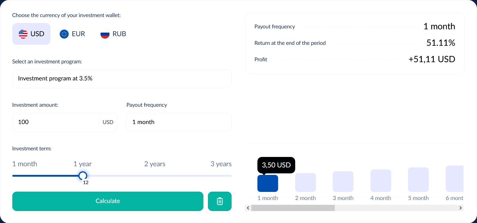 Про инвестиции компания также много не рассказывает. На платформе есть специальная форма, в которой можно выбрать сумму и срок инвестиции, а программа рассчитает процент, который получит пользователь. Однако, как дальше работать с площадкой, непонятно. Подробной информации о способах зачисления средств и вывода на сайте нет.