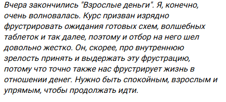 Купил подписку на курсы Юлии Рублевой за 5 тысяч рублей потому что думал что будут конкретные советы по финансам но в итоге на вебинар взрослые деньги вообще ничего полезного не рассказы зачем то говорили про внутреннюю зрелость и отношения с деньгами хотя это вообще никак к доходам накоплениям или инвестициям не относится. Заплатил деньги просто за пустые разговоры какие то больше вайбом инфоцыганства попахивает.