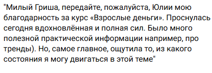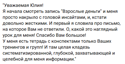 Итак, эти положительные отзывы никак не могут убедить в полезности обучения. Они наглядно демонстрируют, что курсы Юлии не содержат ни малейшей пользы. Скорее всего, она отлично умеет вызывать у слушателей взрыв позитивных эмоций, прикрывая этим самым бессодержательность своего «обучения».