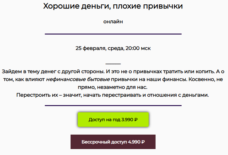 После оплаты пользователь автоматически получит возможность участвовать и в других мероприятиях Юлии. Например, 25 февраля она проведет семинар «Хорошие привычки, плохие привычки».