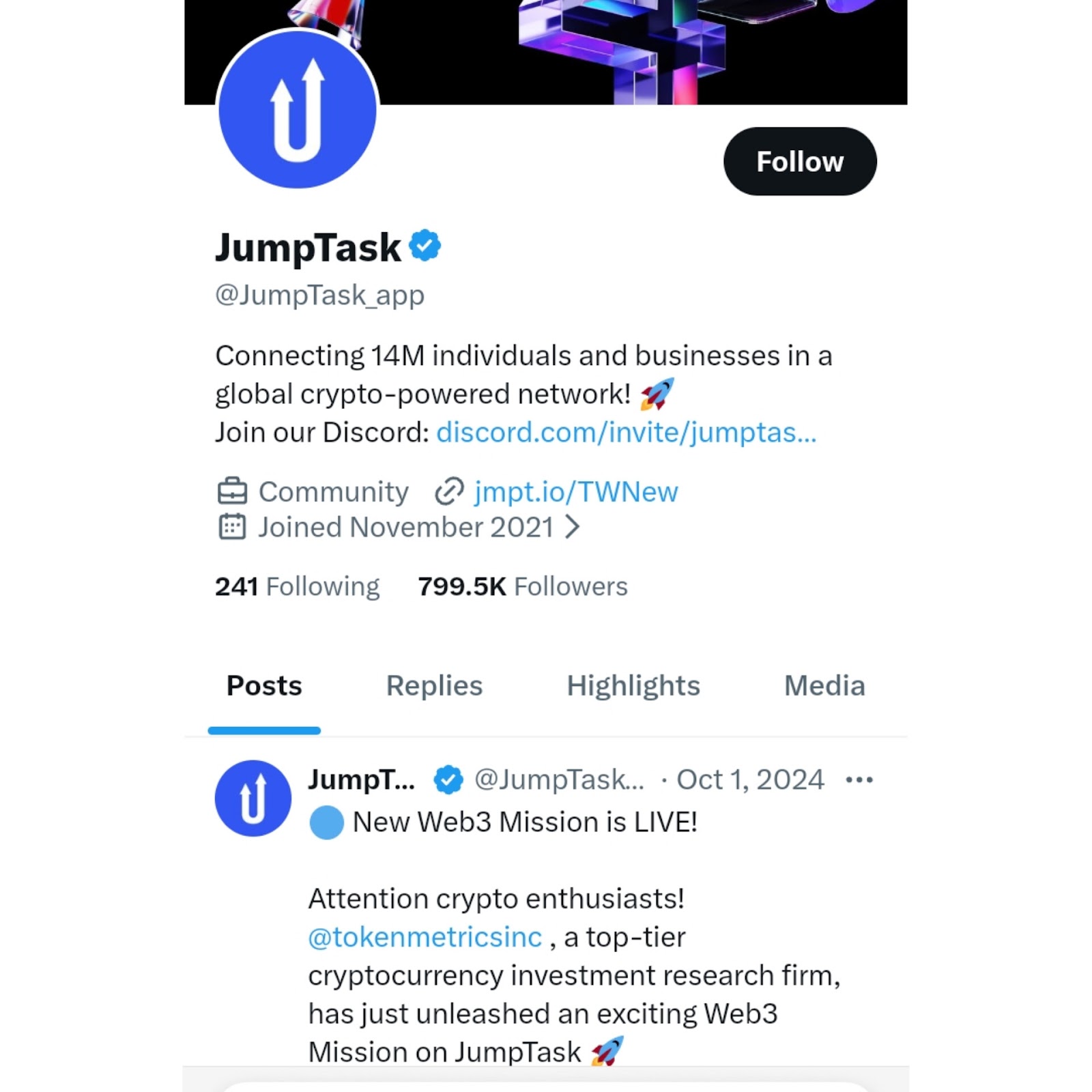 Канал в X JumpTask app функционирует с 2021 года, и здесь 799k фолловеров.