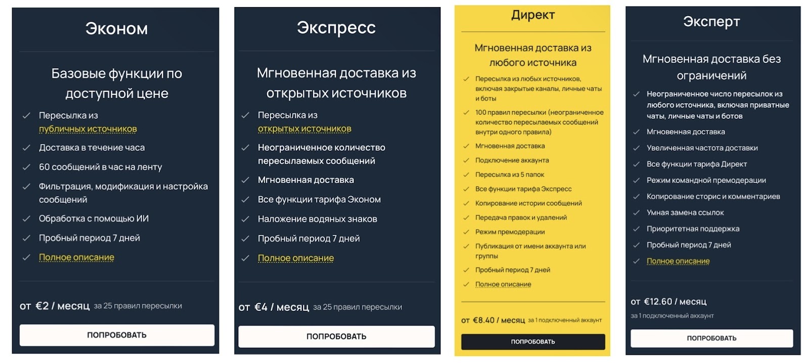 Для работы предлагается 4 тарифа. Обратите внимание, что стоимость не имеет фиксированной суммы — каждый ценник начинается «от».