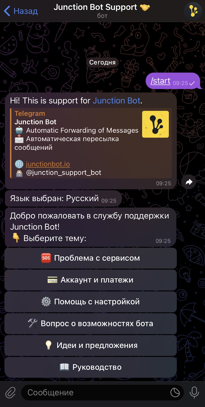 Также есть двуязычный бот для вопросов по работе сервиса junction support bot.