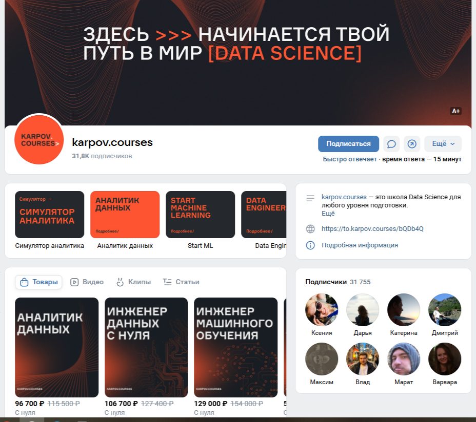 Группу онлайн-школы Karpov Courses можно обнаружить в ВК. Данное сообщество было основано 10 августа 2018 года. Группа имеет 31 000+ подписчиков. Здесь размещается информация, аналогичная постам в Телеграме.