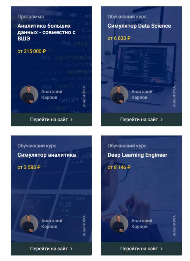 В своей онлайн-школе Анатолий Карпов предлагает целевой аудитории бесплатные и платные курсы. Бесплатно будущим студентам доступны программы «Визуализация данных», «Знакомство с онлайн-магистратурой», «Docker с нуля» и т. д. Платные курсы автора:
