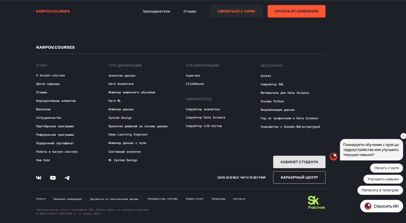 Нами перечислены далеко не все платные и бесплатные курсы онлайн-школы Karpov Courses. Со всеми обучающими программами пользователей ознакомит официальный сайт учебного заведения.