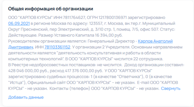 Во время изучения работы учебного заведения мы выявили следующее. ООО «Карпов Курсы» было зарегистрировано 06 сентября 2021 года. На момент обзора онлайн-школа ведет легальную деятельность на основании действующей лицензии и 7 кодов ОКВЭД. В учебном заведении официально работают 22 человека. За последние 3 года выручка школы выросла до нескольких сотен миллионов рублей.