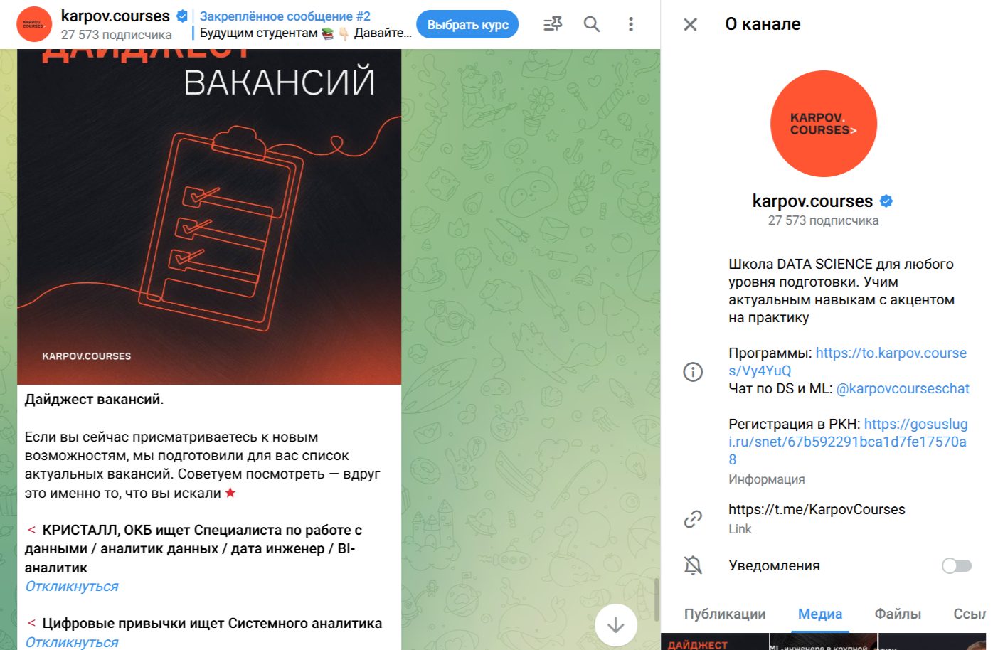 Продвижением курсов школы Karpov Courses авторы проекта занимаются на разных платформах в интернете. Существует ТГ канал Анатолия Карпова. Проект появился в мессенджере 19 июня 2020 года. Он имеет 27 000+ подписчиков. В ленте канала размещаются данные о курсах. Вовлеченность подписчиков ресурса составляет 19%.
