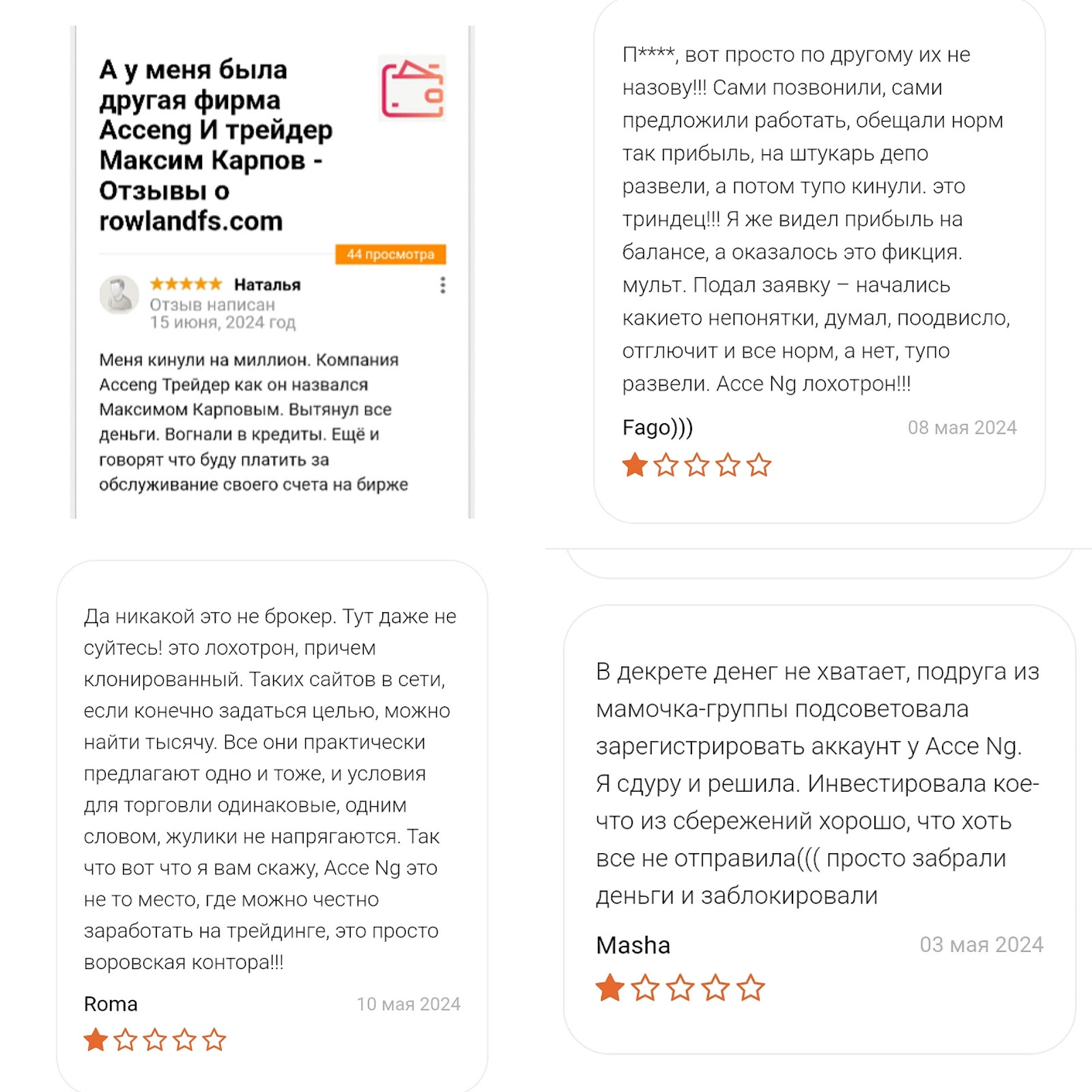 В сети есть отзывы о том, что трейдер Карпов Максим Сергеевич уговаривает совершать больше вложений в Acceng, а после кидает на деньги.