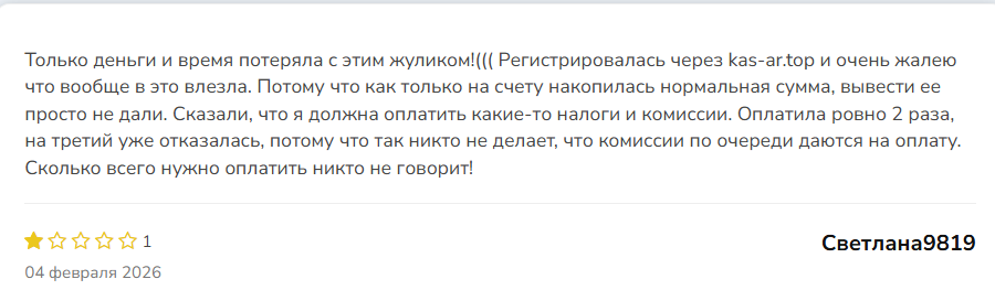 О сайте kasar xyz отзывы негативные. Трейдеры жалуются, что потеряли время и деньги с этой платформой, называют ее мошеннической. Отмечают наличие сайтов-клонов и невозможность вывода заработка. Ниже пример такого отзыва: