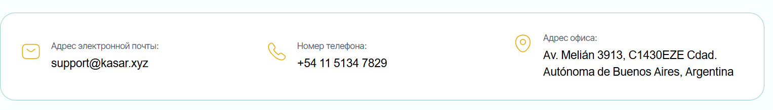 Заявлено, что у компании есть офис в Аргентине. Дается адрес для тех, кто хочет лично пообщаться со специалистом. Также консультации проводят по телефону +541151347829 и электронной почте support kasar xyz.