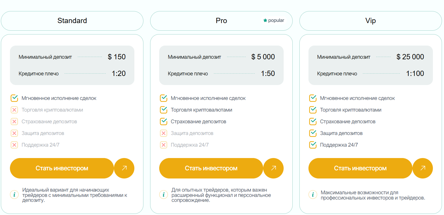 - Pro. Для этого тарифа минимально на счету должность быть 5000 долларов. Кредитное плечо повышено до 1:50. Есть возможность торговать криптовалютой и застраховать свой депозит.