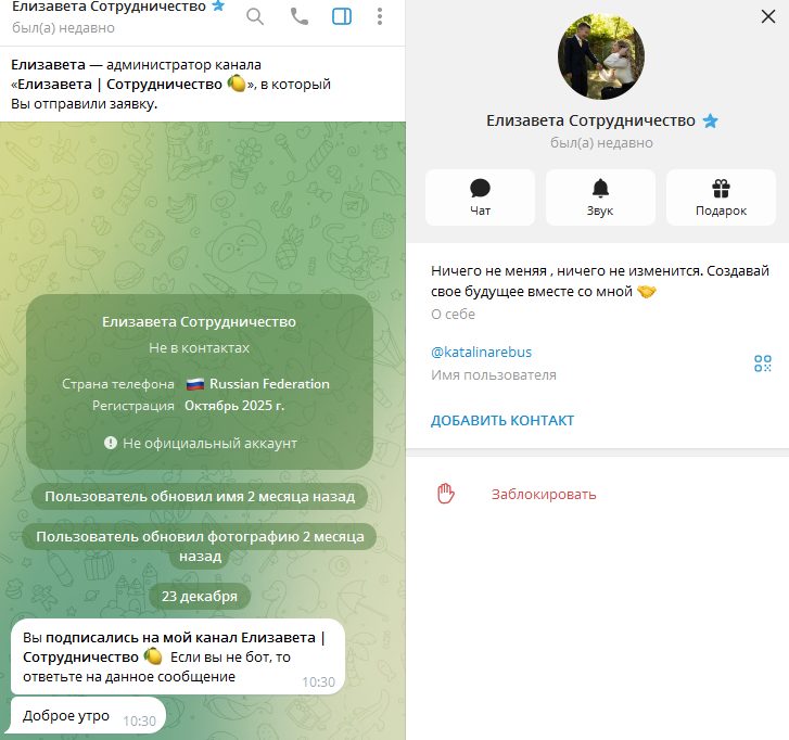По итогам нашего расследования мы пришли к выводу, что с тг-каналом «Елизавета Сотрудничество» связываться не нужно. Множество моментов свидетельствуют о том, что он управляется аферистами, которые занимаются обманом.