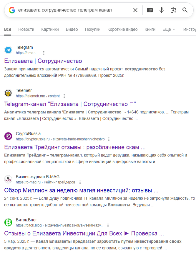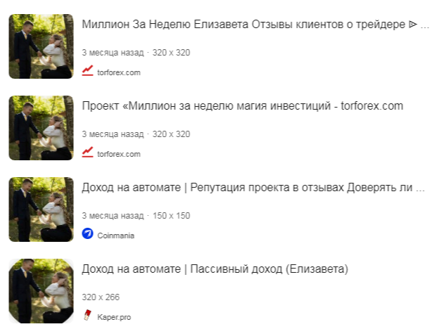 Зато в поисковике высветилось множество статей о других Елизаветах, которые предлагают точно такие же финансовые услуги и обвиняются в мошенничестве. Мы сделали поиск по аватарке блогера и оказалось, что она стоит еще на нескольких инвестиционных проектах, которые обещают легкий и быстрый заработок.