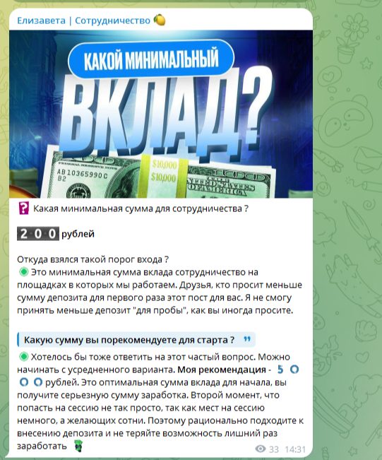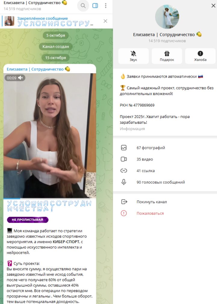 В рамках телеграм-канала Елизавета предлагает сотрудничество и стабильный высокий заработок. Инвестор заявляет, что имеет доступ результатами спортивных событий. Якобы отправив ей деньги, она поставит их с учетом итогового результата, то есть выигрыш для клиента гарантирован.