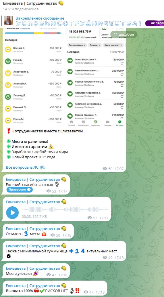 «Елизавета Сотрудничество» — телеграм-канал девушки, которая называется себя профессиональным трейдером и предлагает работать и зарабатывать вместе с ней. В сети о данной личности информации нет, хотя на блог подписано почти 15 тысяч зрителей.