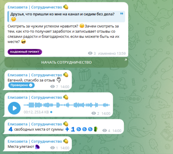 Обзор телеграмм-канала «Елизавета Сотрудничество», анализ деятельности и отзывы о трейдере Katalinarebus