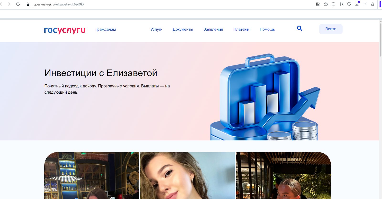 Елизавета в сообществе пишет, что работает с цифровыми валютами 7 лет. Она создала команду, и вместе с ней зарабатывает на пампинге крипты. Девушка пытается вызвать доверие, оставляя ссылку на Госуслуги, однако площадка поддельная.