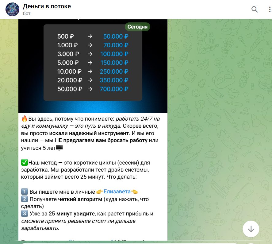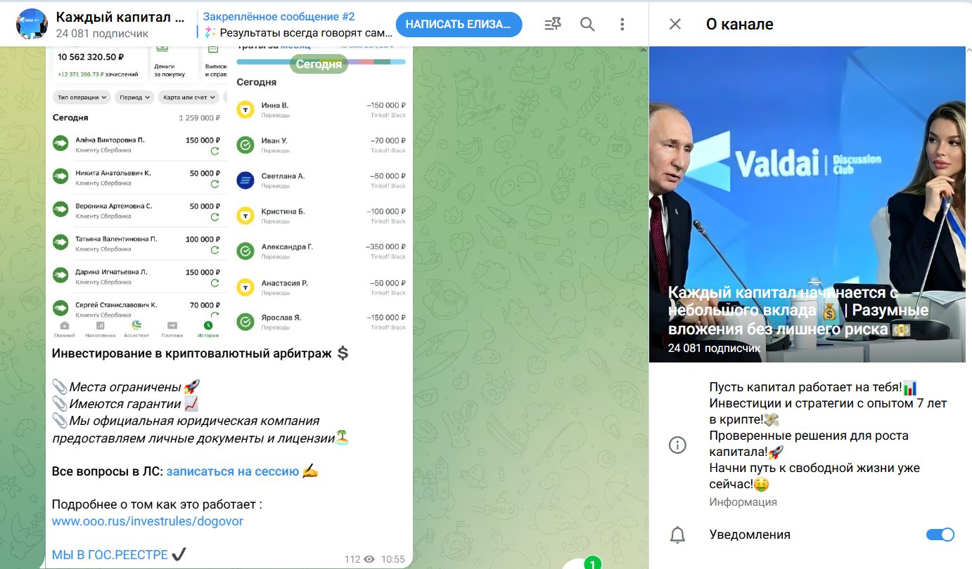 Каждый Капитал Начинается с Небольшого Вклада — это Telegram канал, посвященный услуге по раскрутке вложений. Его создательница Елизавета пишет, что занимается инвестированием в криптовалютный арбитраж и знает способы увеличения средств без рисков. Клиентов уверяет в официальной деятельности, однако далее расскажем о проекте правду.