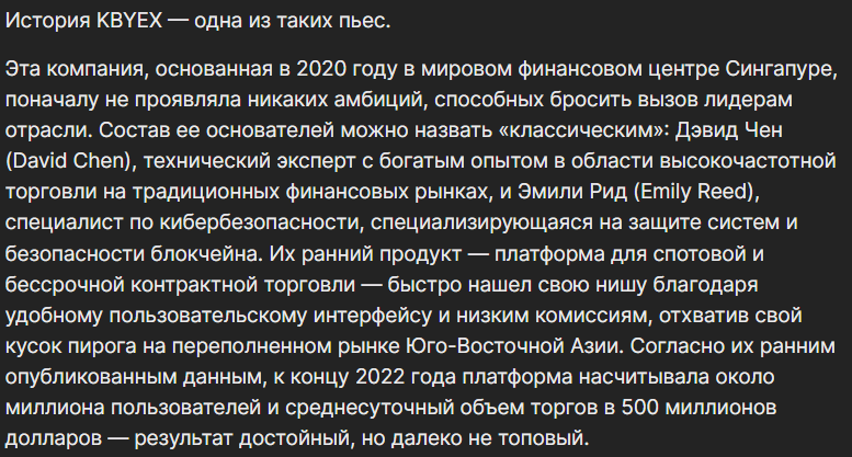 В русскоязычном сегменте интернета в октябре появились обзоры на компанию. Как-то так получилось, что там ложная информация, которая конфликтует с написанным на сайте. KBYEX — компания из Сингапура, работает с 2020 года и активно развивается. В 2022 году ежедневный оборот на платформе превысил $500 000 000.