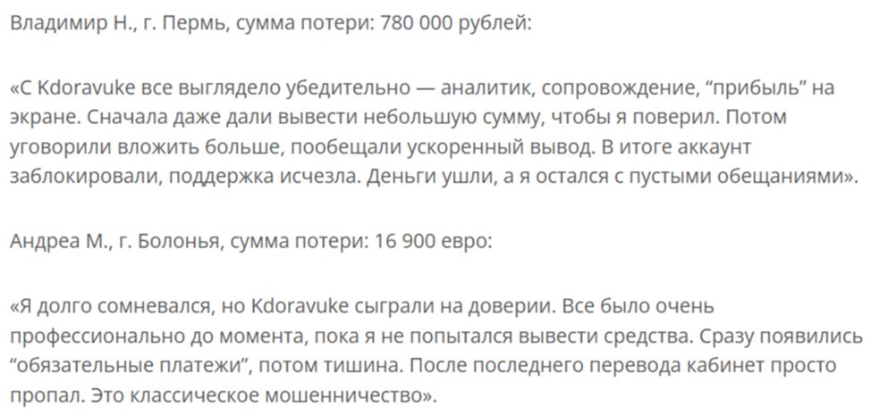 Деятельность брокерской компании Kdoravuke анонимная, так как нет информации об администрации и сотрудниках. На сайте находятся поддельные сведения. Так действуют только мошенники. Еще на сайте написано, что работа брокера началась в 2014 году. На самом деле доменный адрес зарегистрирован в 2025 году.