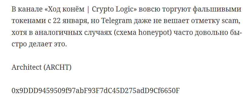 Проект начал работать относительно недавно. Он позиционируется как авторитетный тг-канал, где трейдеры могут узнать о криптовалютах полезную информацию. Она основана на практике и опыте специалистов, поэтому тут нет иллюзий и других лишних элементов. Но на практике оказывается, что вместо реальной аналитики перспективных монет здесь раскручивают еще не прошедшие листинг токены. В итоге они оказываются ханипотом. Канал продолжает работать, не получая отметок о мошенничестве, что позволяет искать новых жертв для развода.