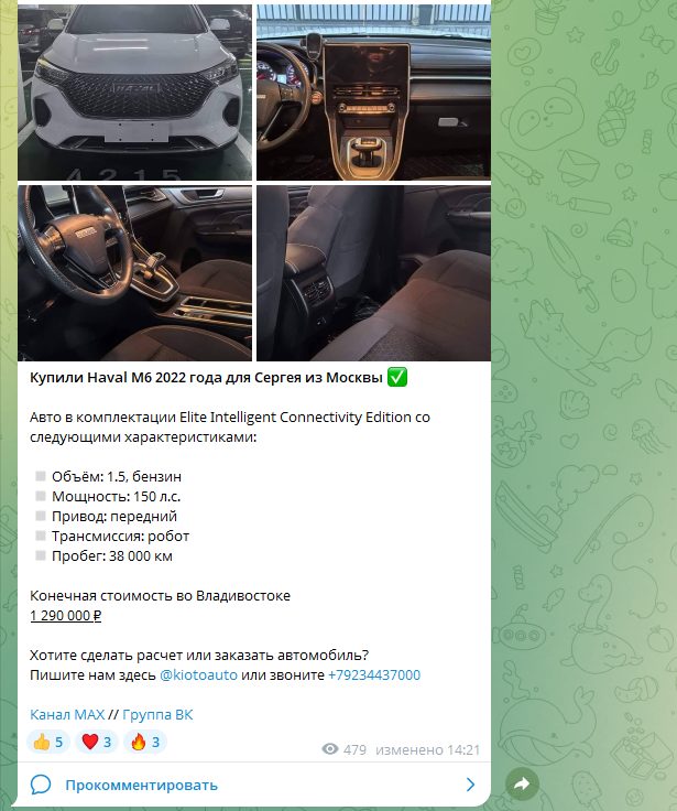 Также клиент может написать одному из менеджеров «Киото Авто», чтобы узнать о конкретной модели, возможности ее выкупить и привезти в целевой город в России.