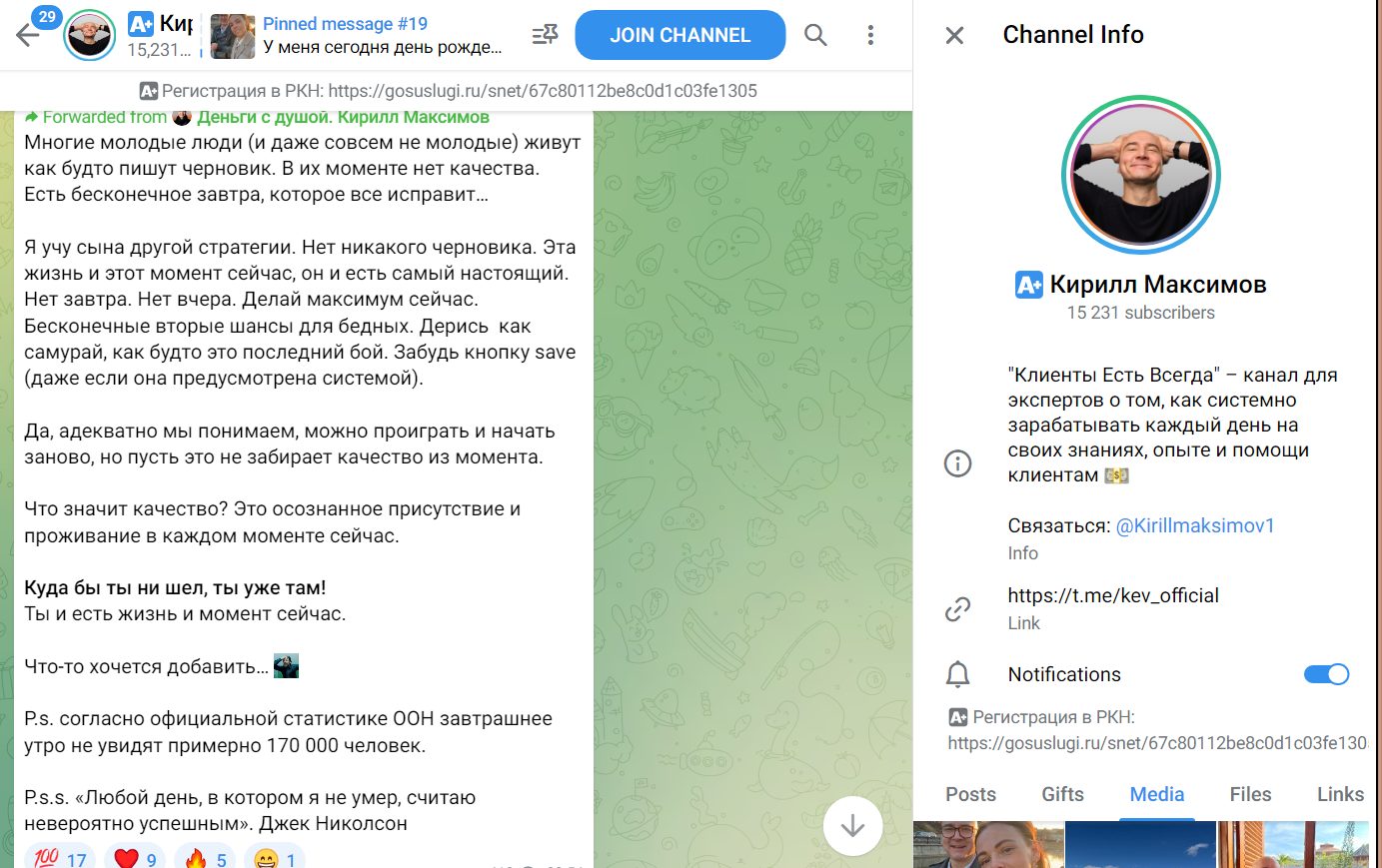 Паблик внесен в реестр РКН. В тгк Кирилл размещает инструменты, которые помогают сохранять время при работе в онлайне, делится опытом в бизнесе. Также анонсирует мастер-классы, вебинары, рассказывает о других услугах. Новые публикации размещаются практически ежедневно. Для связи с подписчиками админ оставляет страницу Kirillmaksimov1.