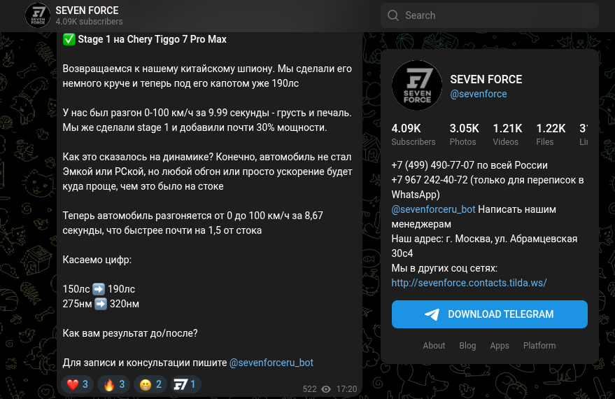 - ТГ-канал «SEVEN FORCE Тюнинг Авто» на автомобильную тематику, где Стулов указывает себя как основателя. Здесь админ пытается доказать свой предпринимательский бэкграунд, но прямой связи с инвестициями паблик не имеет.