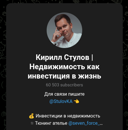 - Линейка по недвижимости завязана на «Кирилл Стулов | Недвижимость как инвестиция в жизнь» (@kirill stulov official), где публикуется контент о доходных объектах, «пульсе рынка» и примерах сделок.